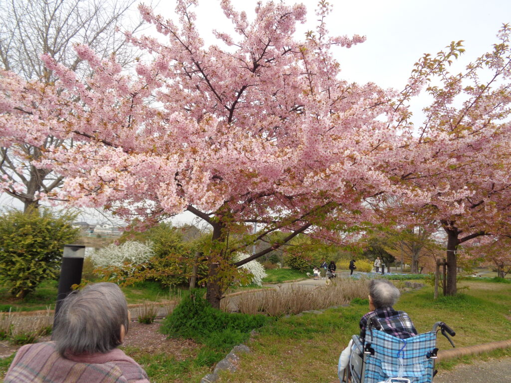背の低い桜をそっと見上げて「あ、桜だ」と呟き、こぼれるような笑顔を見せてくださったご利用者様。