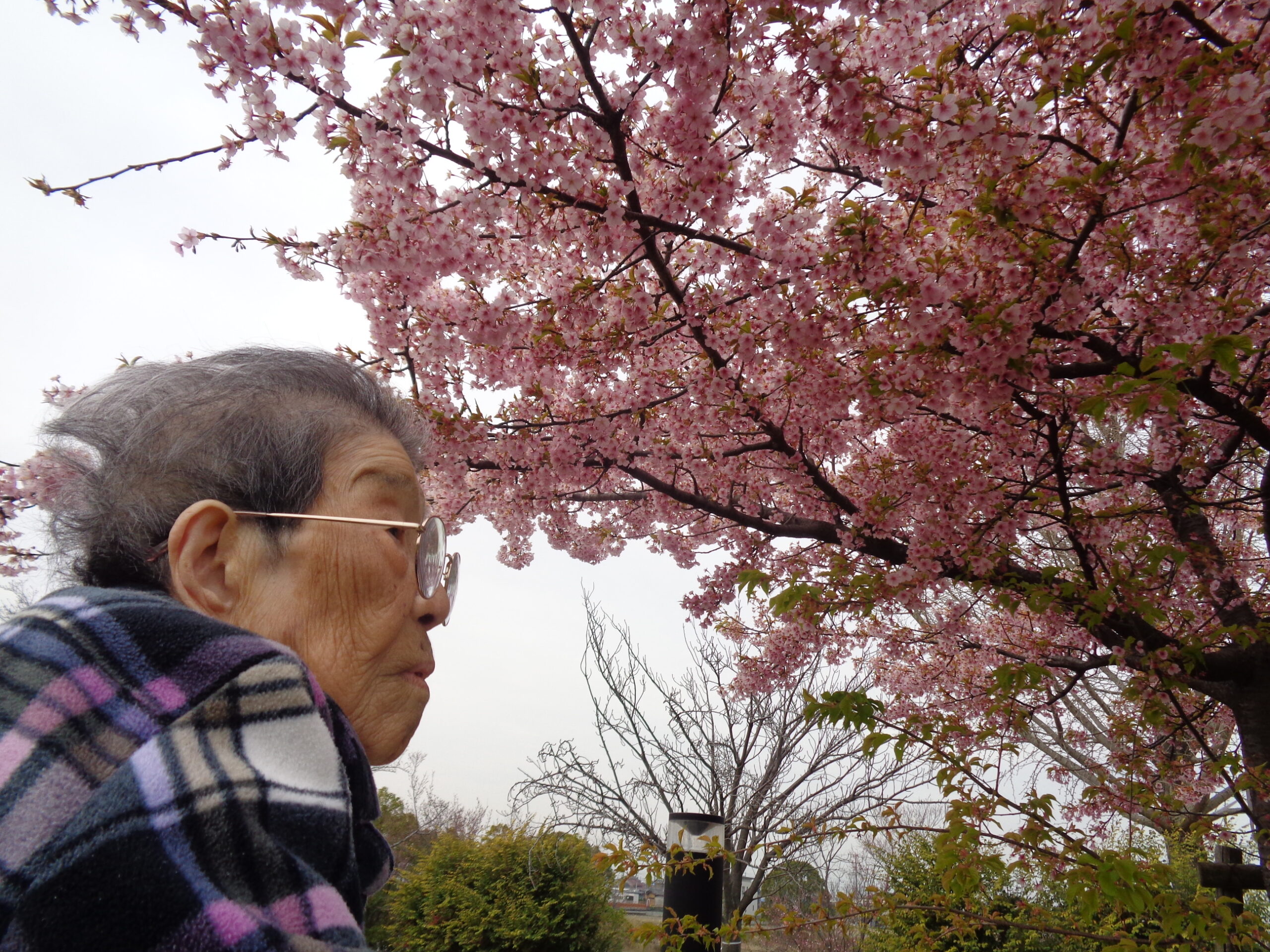 背の低い桜をそっと見上げて「あ、桜だ」と呟き、こぼれるような笑顔を見せてくださったご利用者様。